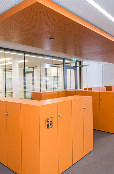 Unsere Leistungen: Fertigung und Einbau der Möbel und der abgehängten Decke in Orange sowie weiterer Einbauschränke